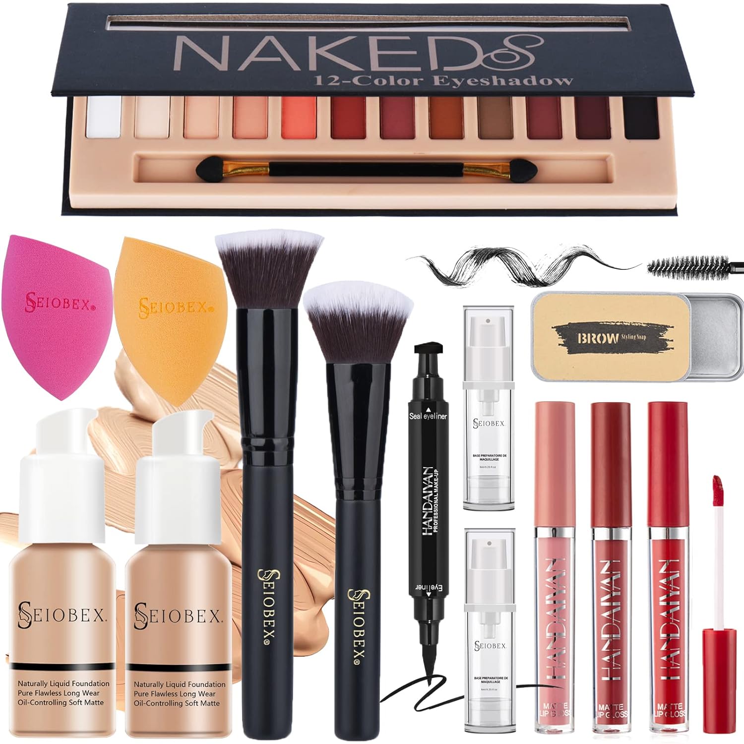【Full Face Makeup】It is All In One Makeup Kit, provides you with all the necessary and basic makeup tools you need, including 12 colors naked eyeshadow palette, 2 pack Seiobex foundation, 2 pack Seiobex primer, 2 pack makeup brush, 2 pack makeup sponge, eyebrow soap, black winged eyeliner stamp and 3 pack liquid lipsticks.