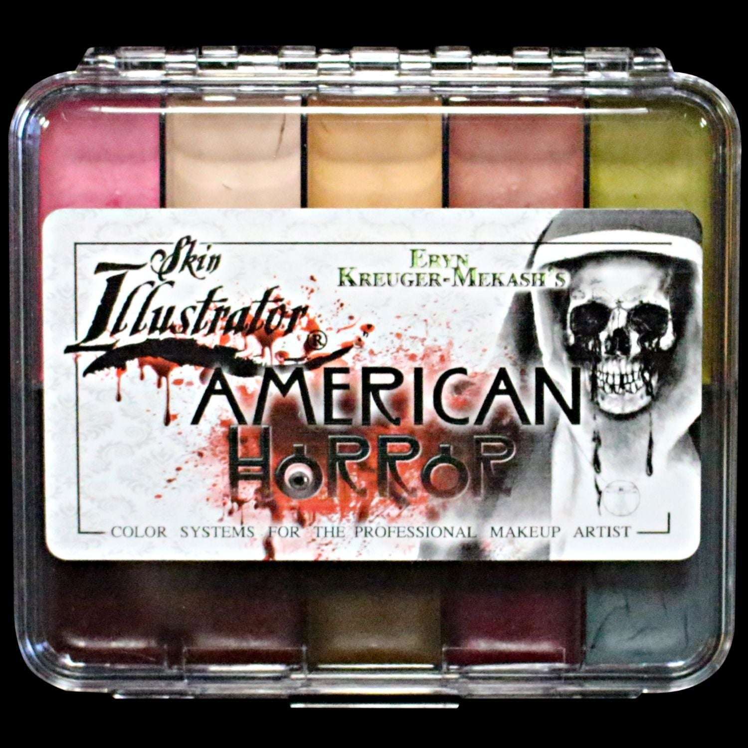 Created for American Horror Story's Makeup Dept. Head, Eryn Krueger Mekash. This unique palette contains two new colors specifically designed by her makeup crew for the AHS series. 'Coven' and 'Assylum' were added to the palette to meet the demanding needs of AHS. From beauty and old age to bloody zombies and witches, the American Horror Palette is an intrigal part of this award winning show