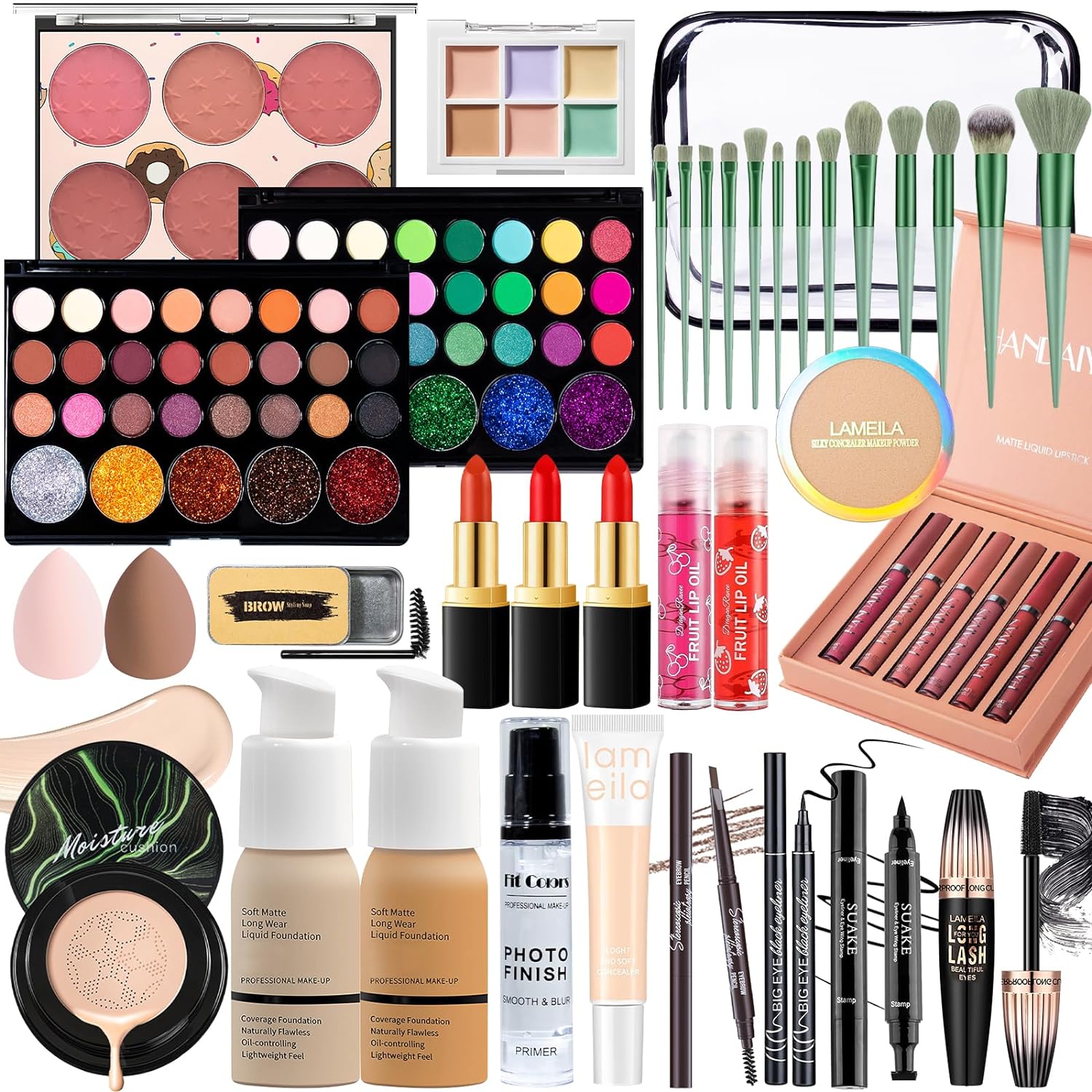 [All in One Makeup Set] The makeup gift set for women includes natural mushroom head air cushion cc cream, full coverage natural & buff Beige foundation, face primer, 2 × 29 colors eyeshadow palette, liquid concealer, counter palette, blush palette, makeup setting powder, eyebrow soap, eyebrow pencil, eyeliner, winged eyeliner stamp, waterproof mascara, lipsticks, liquid lipsticks set, lip oil, makeup brush set, makeup sponges, cosmetic bag.