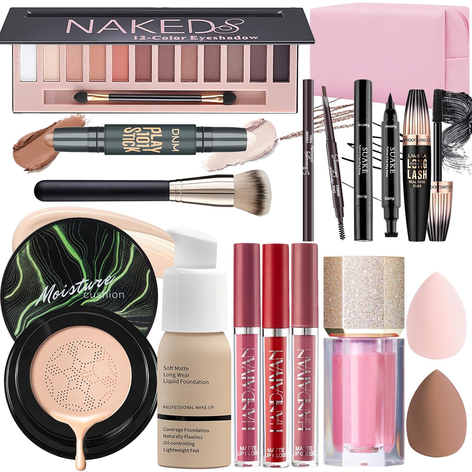 [All in One Makeup Gift Set] The all-in-one makeup set for women includes matte 12 colors naked eyeshadow palette, full coverage natural foundation, natural mushroom head air cushion cc cream, retractable eyebrow pencil, winged eyeliner stamp, waterproof mascara, dual-ended counter stick, liquid face blusher, 3 colors matte velvet liquid lipsticks, makeup brush, 2 makeup sponges, waterproof cosmetic bag. It can meet all the makeup starters’ or professional makeup artists’ needs for daily makeup.